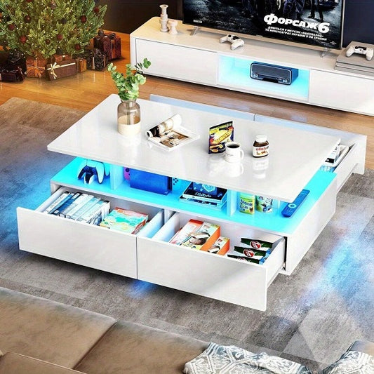 High Gloss Modern Coffee Table With RGB LED Light Black and White Rectangular Coffee Table for Living Room With Storage Compartment and Remote Control