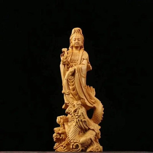 Natural Wood Hand Carved Kuan Yin Buddha Statue Symbolizes Peace, Love, Calm, Creates Balance and Harmony