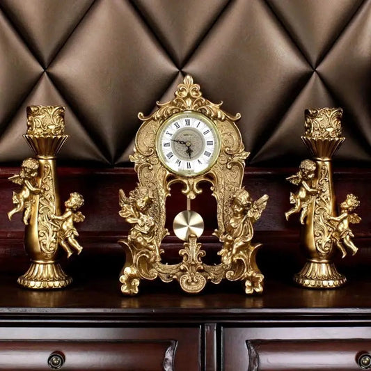 Grand Luxurious Vintage Pendulum Quartz Clock with Angels and Two Candle Holders Set