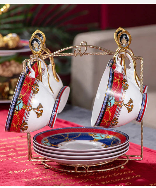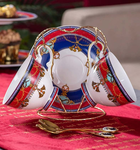 luxurious Royal Palace Style Classic Red and Blue Coffee and Tea Set Hand Made Bone China Porcelain Real Gold Leaf Set for Four