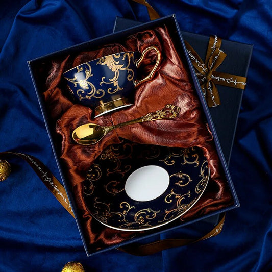 Luxurious Royal Palace Style Classic Coffee and Tea Set Blue Hand Made Bone China Porcelain Real Gold Leaf Set for One