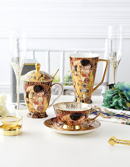 Gustav Klimt Romantic Design Bone China Coffee Cup Set luxury Porcelain Tea Cup Caffe Mug With Lid Cover