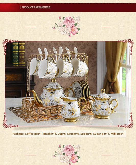 Unique English Royal Style Coffee and Tea Set with Vintage Art Hand Made Fine Porcelain 24 karat Gold Plated To Serve 6 Person