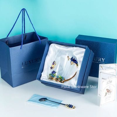 Transparent Glass Coffee Tea Mug Blue and Red Roses Heat-Resistant Cup Gift Sets Set with Stainless Steel Spoon and Coaster