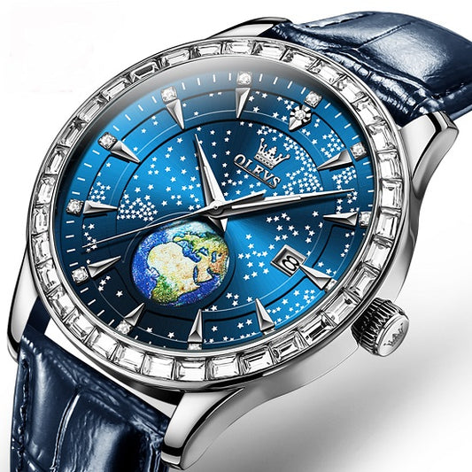 Blue Planet Collection Luxury Multi Fnction Chronograph Waterproof Luminous Quartz Watch For Man with Starry Sky and World Calendar by Oleves