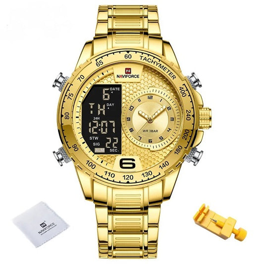 Mens Top Brand Newest Design Multi-function Chronograph Tachymeter Quartz Alarm Digital Waterproof Luminous Gold Gold Watch