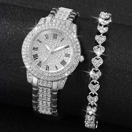 2pcs Luxury Elegant Women Stainless Steel Band With Diamonds Quartz Watch and Dimond Bracelet Set