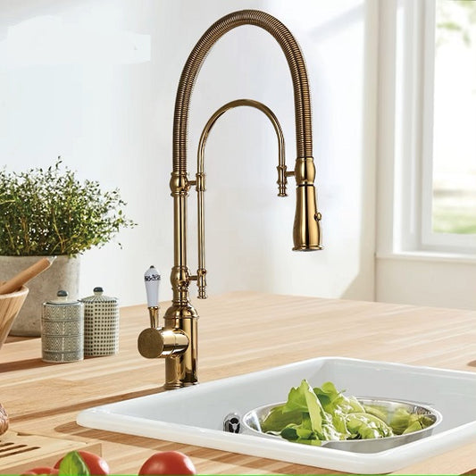 Luxury Elegant Retro Design Kitchen Solid Brass Pull-Out Dual Control 2 Function Faucet Single Hole Deck Mounted