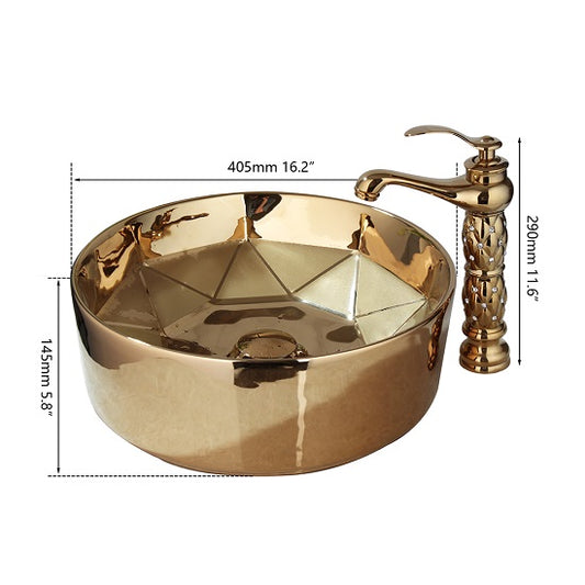 Round Gold Ceramic Bathroom Combined Washbasin Vessel Basin Sink and Solid Brass Faucets