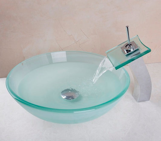 Oval Tempered Glass Hand Painted Waterfall Spout Basin Sink with Faucet Combination