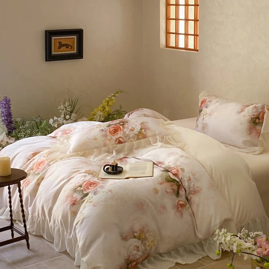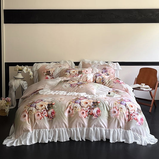 Luxury Romantic French Flowers Lace Ruffles Soft Silky Ice Silk Duver Cover Bedding Set with Pillow Cases
