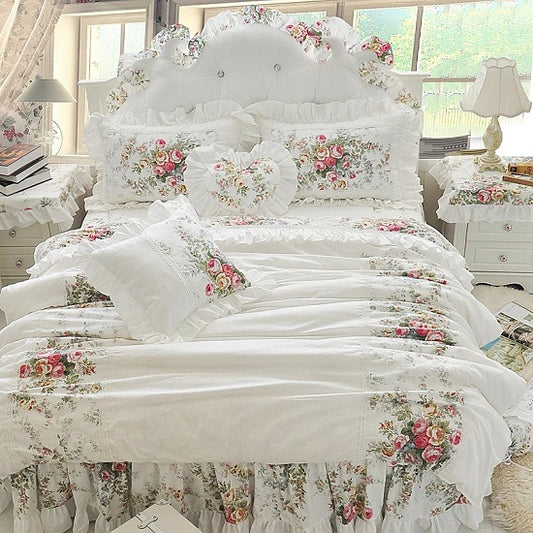 Luxury Romantic Princess Flowers Cotton Chiffon Lace Ruffles Duvet Cover Bedding Set With Pillow Covers