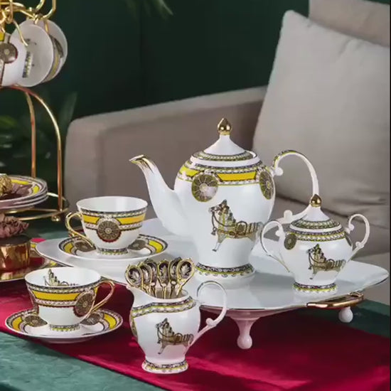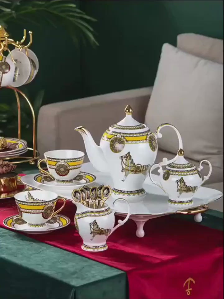 Elegant Luxury English Royal Court Style Hand Made Fine Porcelain Bone China Gold Plated Coffee and Tea Set 10 Pices